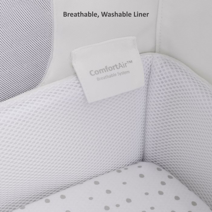 Sleep well, feed easily and be closer to your baby with the SnuzPod⁴ Bedside Crib. Now even more breathable thanks to its innovative comfortair system, with unique air flow vents, machine washable mesh liner, and improved base ventilation, helping to regulate your baby’s temperature for a good night’s sleep. Also boasts a lightweight removable bassinet, and new breathable mattress with a 3D mesh cover for all round better support.